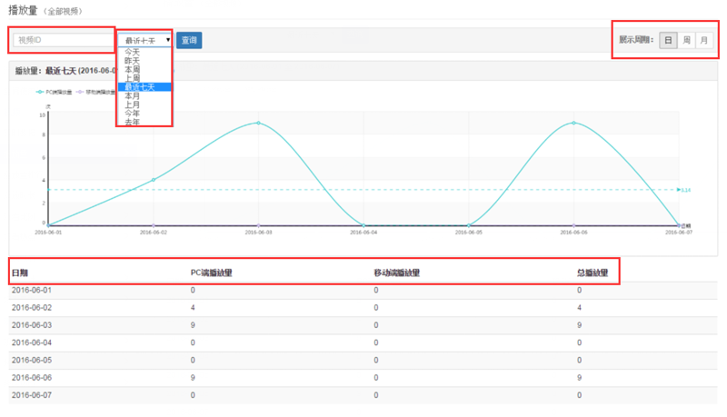 (2)播放量:支持通过输入视频ID,查看选择不同时间段的该视频的PC端、移动端播放量的情况。