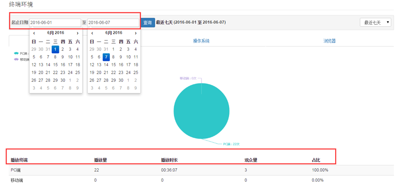 (3)终端环境:可查看任一时间段的播放终端环境(PC端、移动端)的播放量、播放时长、观众量、占比的统计情况,如下图所示: