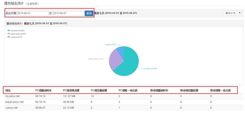 (3)播放域名:可选择任一时间段进行查看视频播放域名,查看每个域名的播放时长、播放量情况,如下图所示: