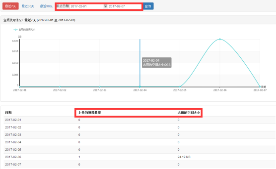 (3)空间使用情况:该界面提供对任一时间段的流量使用情况进行查询,并详细到每天上传的视频数量、视频占用空间大小进行统计,如下图所示: