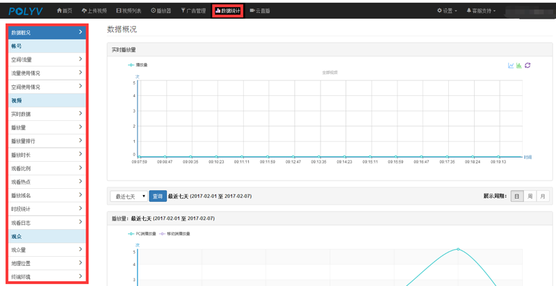 保利威视后台功能【数据统计】主要包括数据概况、账号(空间/流量、流量使用情况、空间使用情况)、视频(实时数据、播放量、播放时长、播放域名等)、观众(观众量、地理位置、终端环境)。下面简单介绍下各个统计功能。