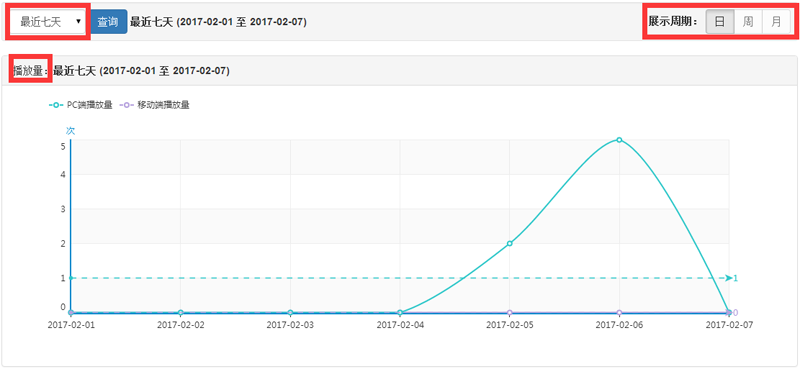 (2)播放量、播放时长、观众量、观看比例:提供不同时间段的数据统计,用户可自行设置查询。以最近七天的播放量为例的图示如下: