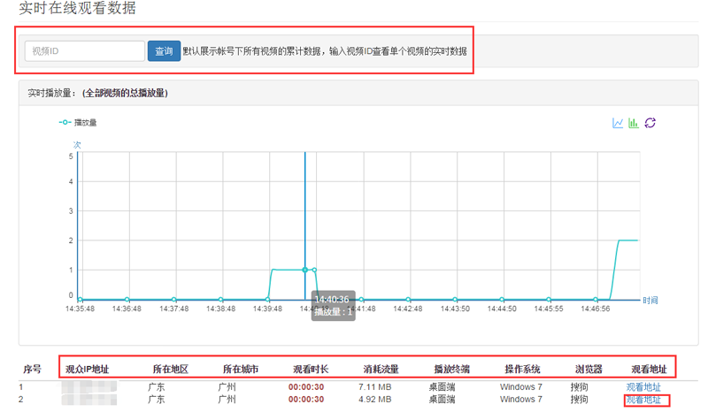 (1)实时数据:可查看账号下的全部视频的实时播放量,也可通过输入视频ID,查看单个视频的实时播放量,如下图所示,点击图中所示的“观看地址”可观看视频。