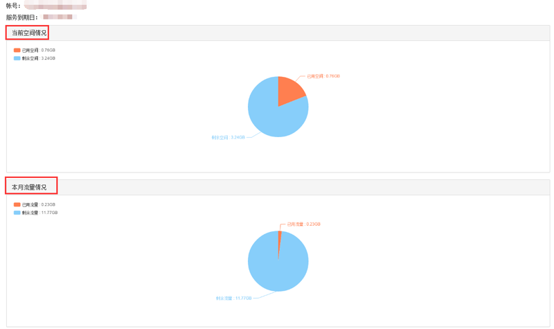 (1)空间/流量:可以了解到空间、当月流量的使用总体情况,如下图所示:
