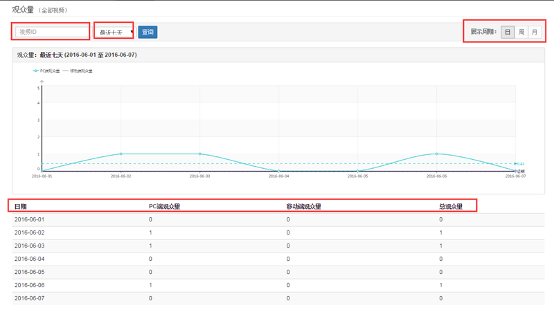 (1)观众量:可清晰地查看到视频在某段时间的PC端、移动端的观众量,并支持查看单个视频的观众量情况,如下图所示: