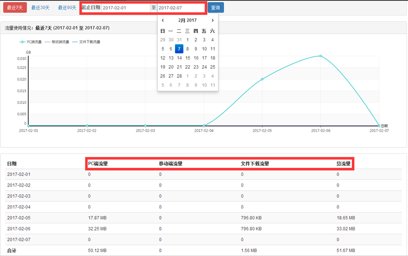 (2)流量使用情况:该界面提供对任一时间段的流量使用情况进行查询,并详细到每天对PC端、移动端、文件下载量、总流量进行统计,如下图所示: