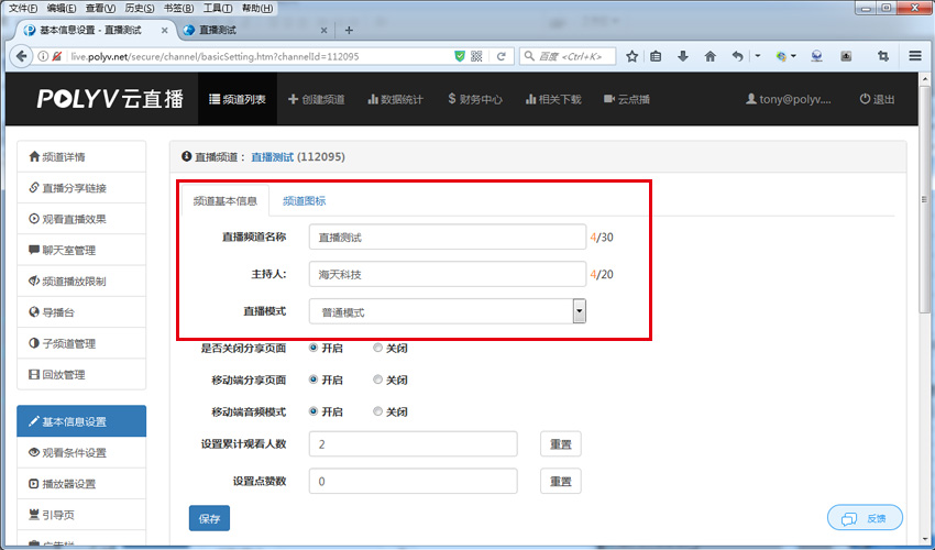STEP3 . 设置直播观看页 操作 :保利威视管理平台 POLYV云直播 频道列表,如下图: 操作 :设定您直播频道的基本信息,例如设定本次直播活动的名称等。 STEP4 . 发起直播 操作 :保利威视管理平台 POLYV云直播 相关