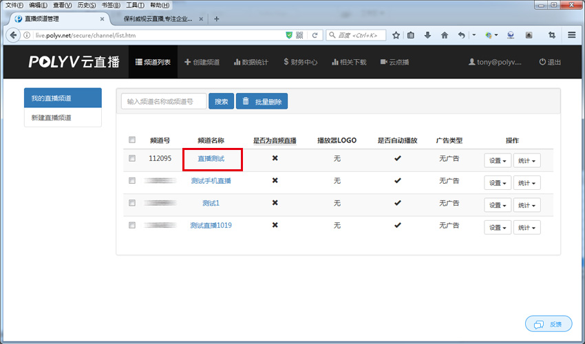 操作:保利威视管理平台 >> POLYV云直播 >> 频道列表,如下图:
