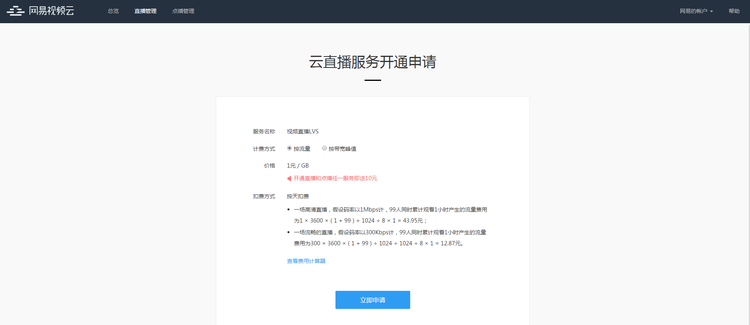 用户基本信息完善后可点击申请开通,进入到服务开通申请页(以云直播申请开通为例),选择计费方式并提交申请,