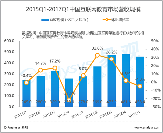 根据Analysys易观监测数据显示,2017年第1季度中国互联网教育市场整体营收规模达458.4亿元人民币,环比下跌4.8%,同比增长64.9%。