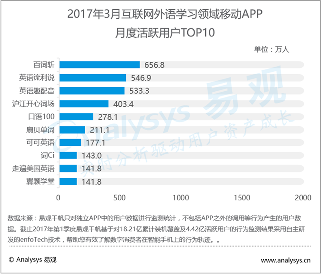 外语学习领域方面,2017年3月百词斩以656.8万占据首位,英语流利说以546.9万位居第二,英语趣配音以533.3万位居第三。外语学习的教学内容都强调循序渐进与每日练习,需要学习者坚持利用碎片化时间学习,所以外语学习总体也保持着平稳的用户情况。