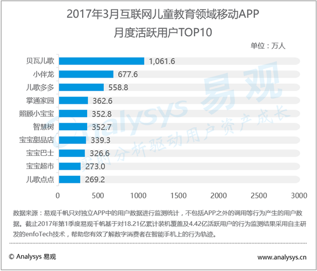 聚焦到各个细分领域内,2017年3月儿童教育APP月度活跃用户规模对比来看,贝瓦儿歌以1061.6万占据首位,小伴龙以677.6万位居第二,儿歌多多以558.8万位居第三。儿童教育APP丰富,与其他互联网教育二级领域相比,在数量上占据明显优势。此外,相对于其他教育内容,针对于0-6岁儿童的特性,儿童教育产品也多为音乐、游戏类娱乐性APP为主。